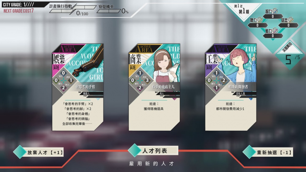 「无名少女成为救世主的游戏」 『倾注世界所有的少女』是一款将卡牌构筑型rouglike与养成游戏所结合的文字冒险游戏。为了将少女培养成救世主,您将成为一名管理官,选择每个回合来访的各具特色的「人才(卡牌)」来达成目标。 「人才(卡牌)效果」例