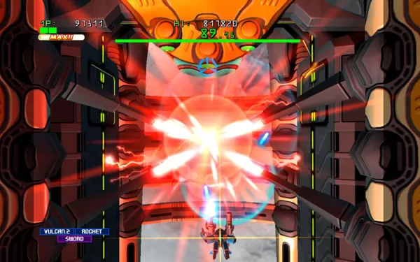 相对于一般的STG射击,精致的画面和极富现在感的机体设定是本作的亮点,另外我方有多种武器可供选择,还拥有近身攻击的刀剑武器。