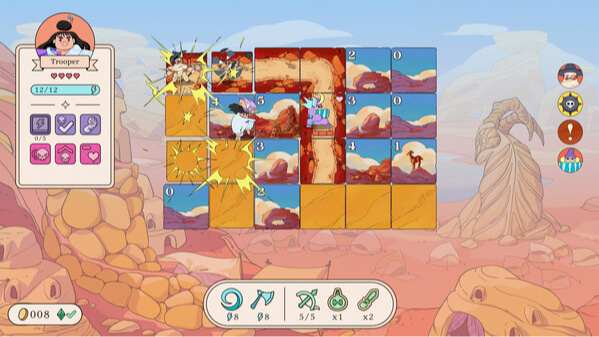 然而,完全和扫雷游戏一样,这只是换皮也毫无新颖性,制作组便在敌人和埋雷上开始深挖。首先是敌人,被翻开格子已经现身的敌人,会开始一个回合数倒计时(每个敌人倒计时数字不一样),倒计时结束前未能击杀敌人,无论什么类型的敌人都会发起一个全地图的攻击,玩家必定掉血。