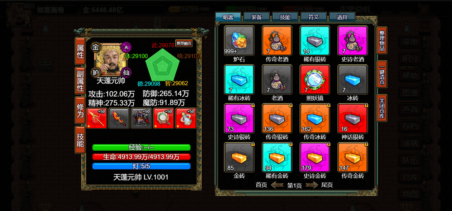 道具商店同理 被动技能商店会根据玩家解锁的图鉴对应解锁 主动技能同理 游戏进程通过完成主线任务解锁(任务会列出该任务需要去什么地图解锁) 在地图上会有一个特殊的明怪 完成会解锁下一个任务的战斗以及物资奖励 其中的一些任务可以选择多种后续任务(此任务的选择决定了顶上的三个系数,此三系数影响到后期的遇怪和主基地商店的解锁) 遇怪规则可以点击顶部的声望说明可以查看 本游戏的底层核心系统是修为系统(修为通过角色升级提高,修为类型可以通过融合增加) 本作招募队友有两种方式:1.战斗中使用技能或道具招募;2,酒馆中使用招募券招募 这一代游戏的五维不设置上限可以通过融合吃药无限提升 伤害计算逻辑如下